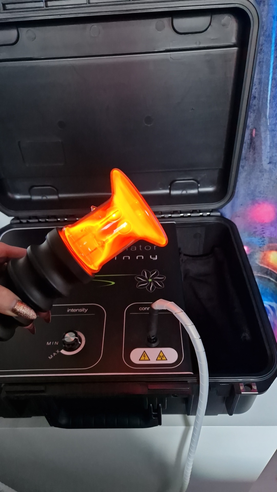 De Rife Tube curved (hand) lamp - orange is een kleine krachtpatser voor o.a. pijnklachten. kort gezegd de Phanotron lamp in het klein met eenzelfde frequentiebereik. Ook is deze gevuld met neon en heliumgas welke ontsteekt bij inschakeling. Door interactie met de omgeving produceert dit een ozon geur. Deze kan je nog licht op de huid ruiken wanneer lokaal behandeld wordt.